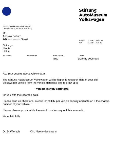 "Don't forget to tell them (a) the chassis number (VIN) of your VW and (b) your own correct name and address. The charge is (as of 1/04) 15 euros, which unfortunately is now $20 US (the dollar's been slipping the past couple of years). [Do not] send an American check due to the high exchange rates the banks charge for checks. (I personally recommend going to your neighborhood bank's International Department and getting 15 euros -- a five and a ten, maybe. That's how I do it.) A twenty dollar [euro] bill would also do the trick."