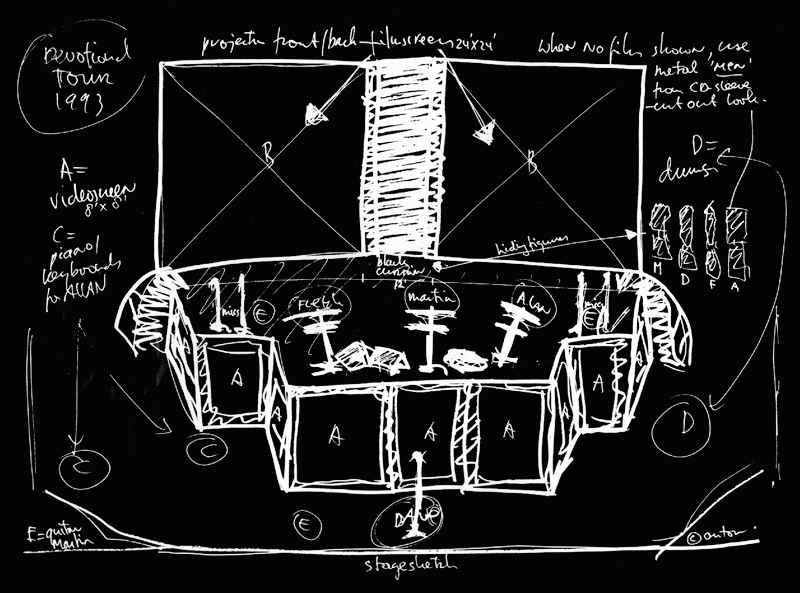 This laser disc is only the second performance film released by Depeche Mode. It was filmed during the Devotional tour during 1993, by Anton Corbijn. This film was a Grammy Award Nominee for Best Long Form Music Video. Devotional was released in France, distributed by BMG video, reference is '74321 17213 6'. The sleeve was printed in Germany and you can read on the laser disc 'Mastered by DADC Austria'. Devotional was also released in Japan, with an extra quotes (In Japanese, with the name of the songs in English) and a drawing of the stage by Corbijn. (Thanks to "innocent" for those last two paragraphs and for scanning the stage layout insert. You can also see a larger version of it (110 KB).) |