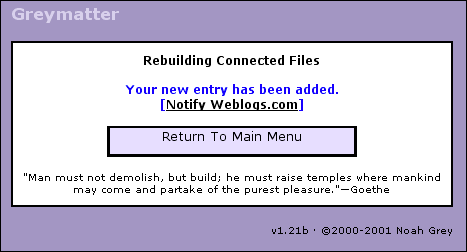 When you click on the "Notify Weblogs.com" link, a new window will open and confirm your action. This technique may be helpful for other people wishing to add additional capabilities to GreyMatter. See also: The Postings in Graymatter's Discussion board, Weblogs.com Changes, and Aaron's article. (All links will open in a new window.) < GM Support > ? # |